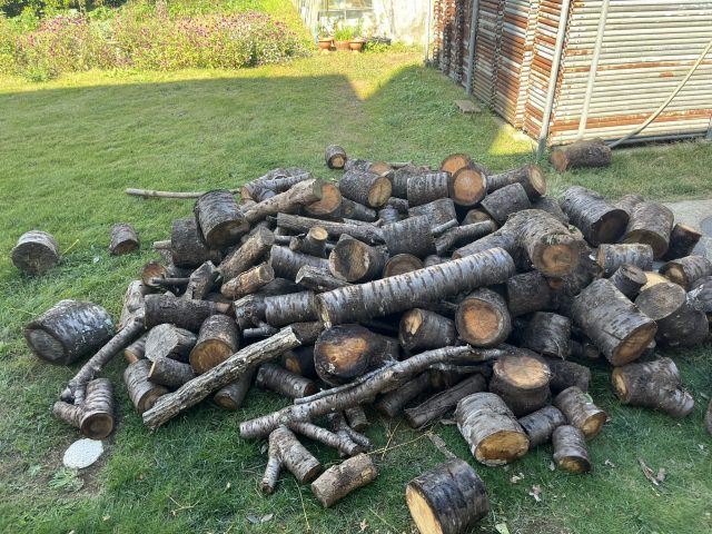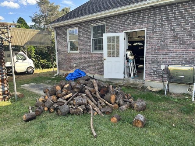 今年は薪が不足してしまい、少し頂いてきました。太いものは斧で割り、長いものは玉切りです。