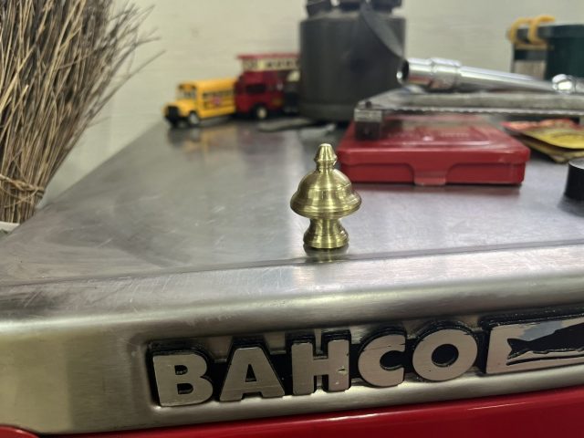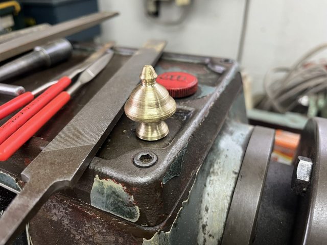 テーブルスタンドのシェードを固定する金具、フィニアルといえばいいのでしょうか。なくなってしまったので、作りました。真鍮の棒にドリルで穴をあけ、ネジを切り、旋盤で形を削り、研磨して終わりです。ネジはインチだったので、タップを輸入しました。すこしおしゃれになったかな。